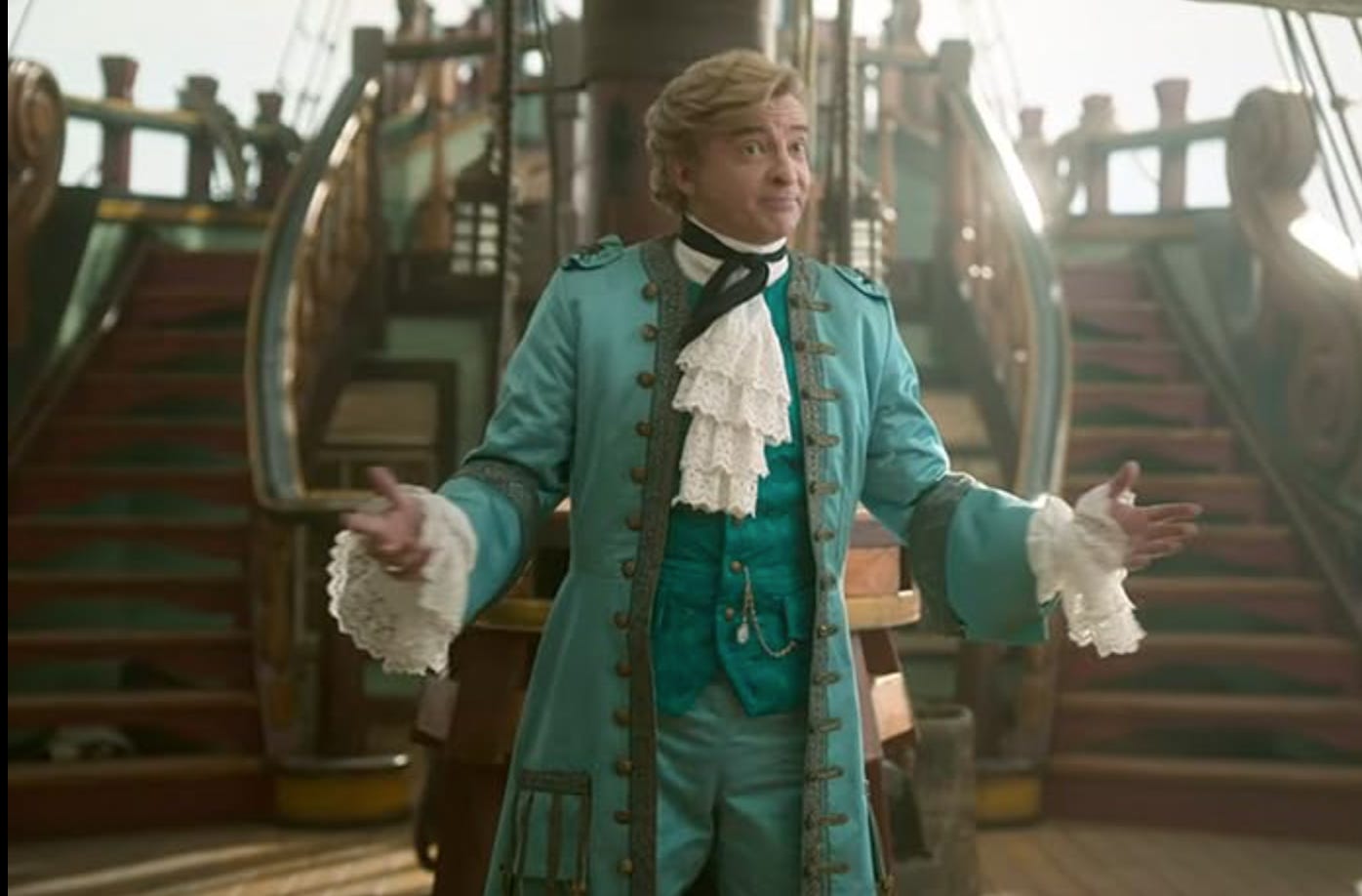 After secretly tailing this mysterious “Gentleman Pirate” who managed to best Blackbeard’s first mate Izzy Hands, Blackbeard boards a ship to find Stede gasping at the end of a noose and gut-stabbed, surrounded by mayhem. Classic meet-cute.